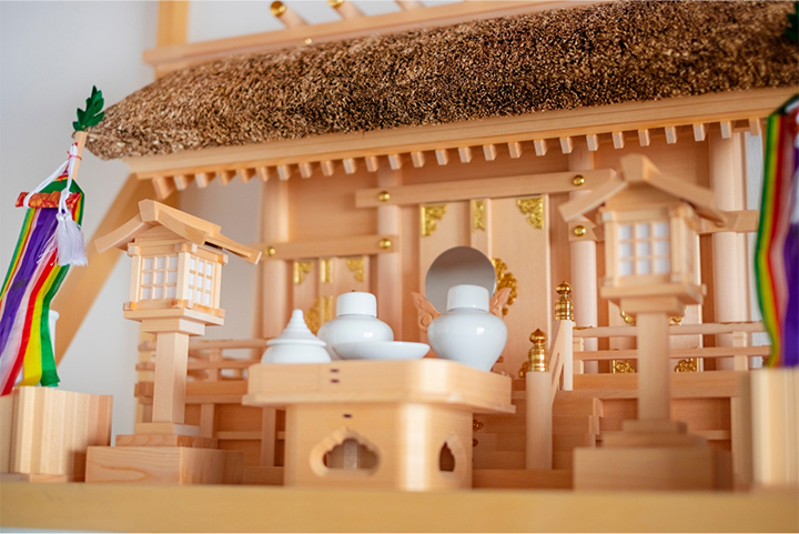 It is possible to simply stand the ofuda on the shelf to venerate them, but most people enshrine them within a “miyagata”, a small version of the sanctuary buildings at a jinja. This container is sometimes also called a “kamidana”, but that word strictly refers to the shelf. There are many different styles of miyagata and kamidana, and recently more have been produced that suit modern and western-style rooms, and so people choose whatever style most appeals to them. The important thing is that the kami are sincerely revered, not the precise form of the kamidana.